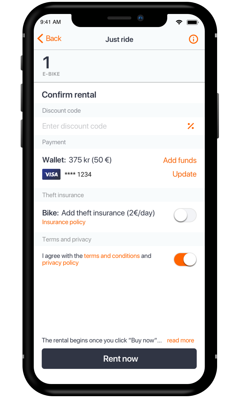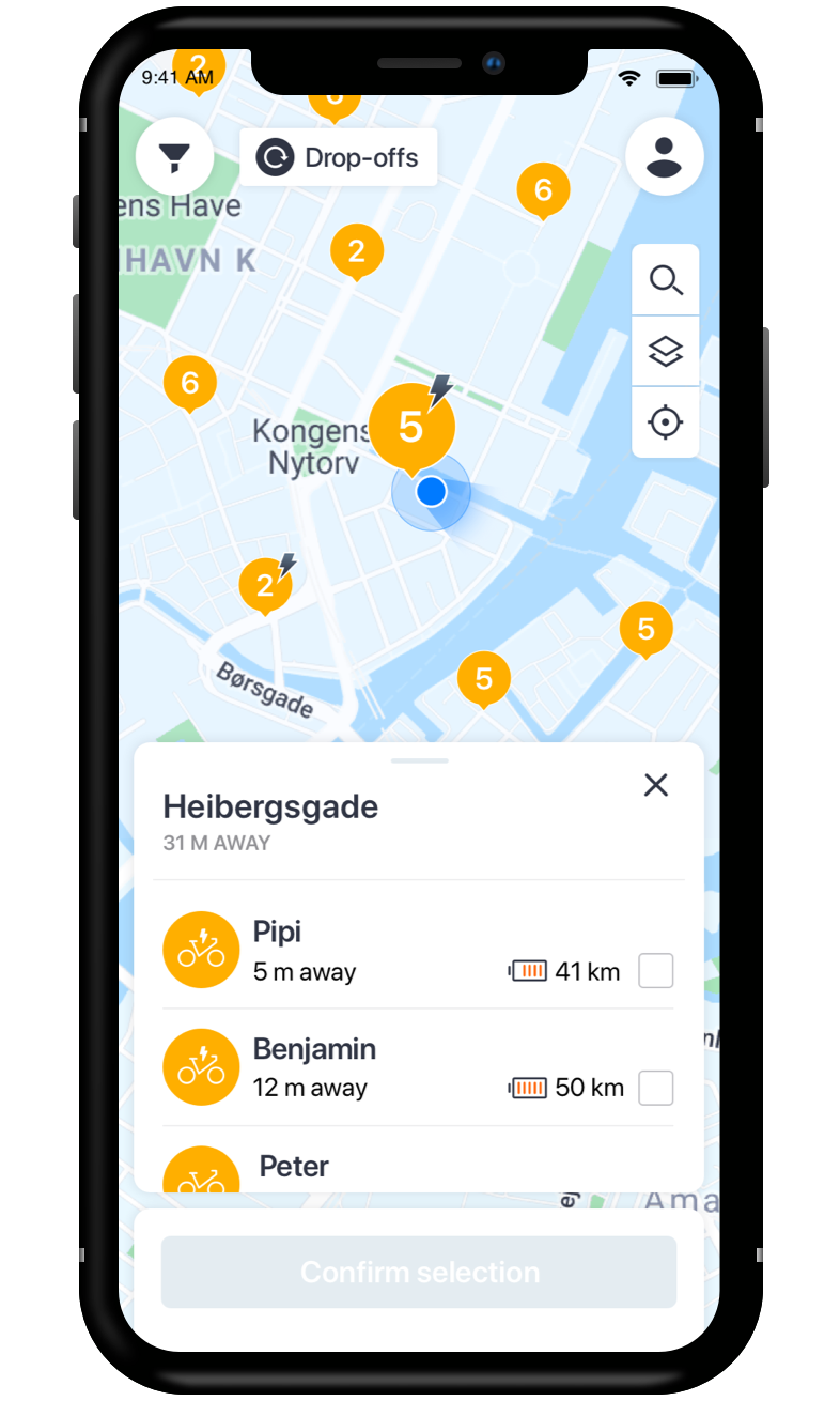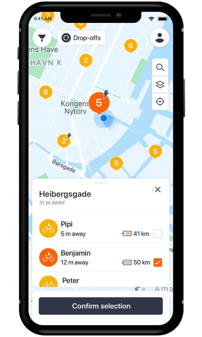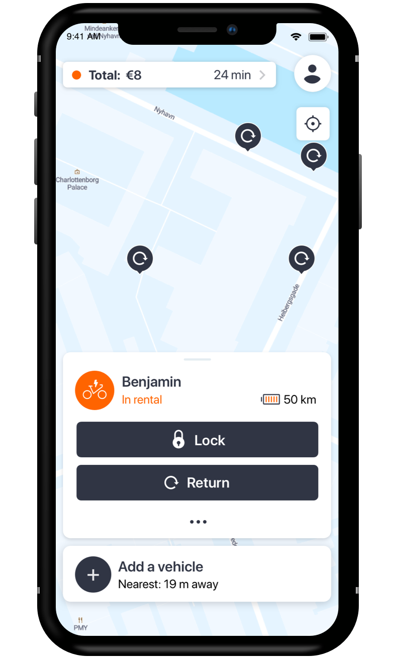 In the original app design, the user could tab on hub markers on the map to select a bike from a hub. The app-controlled which bike was assigned to the user. Only after completing the booking, the app revealed which bike the user had rented together with details like bike name, distance to bike, and for e-bikes the battery level.