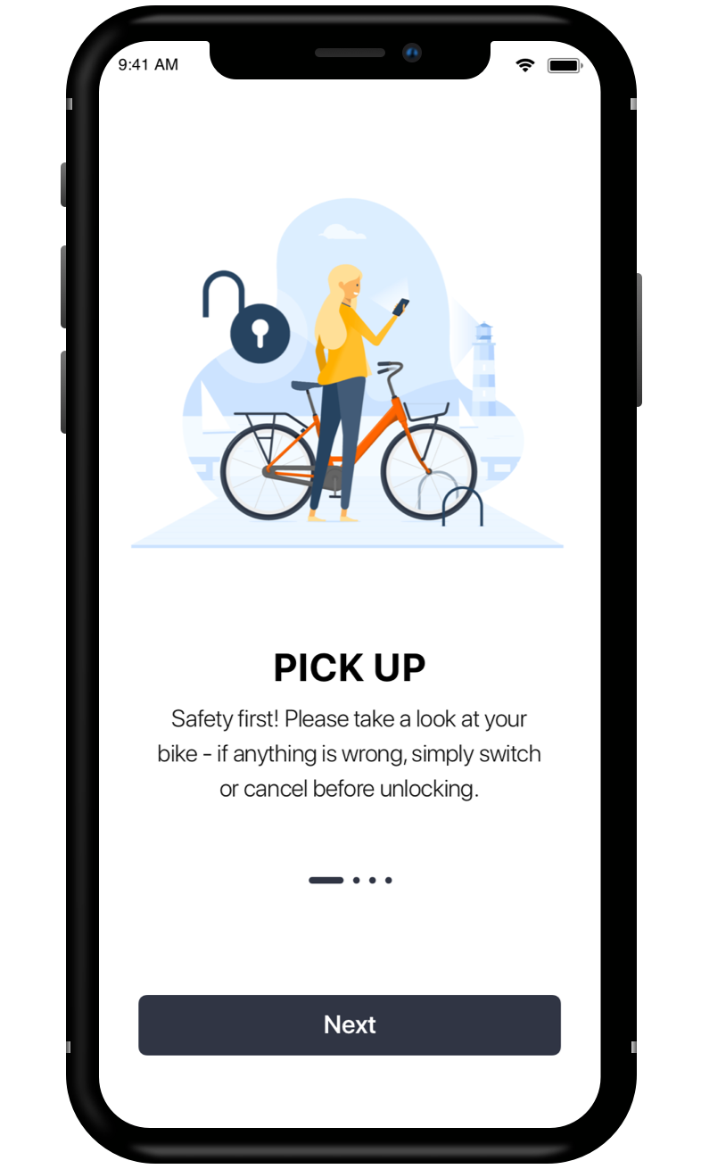 The redesign of the pick-up flow allows the user to easily select a bike matching his needs, whether standing next to a bike or selecting it from a distance. Exposing information on bike name, distance to bike, battery level, and availability upfront, enables the user to make an informed decision before progressing to the booking. When standing in a hub, the user can choose among the available bikes based on the physical condition of bikes and through the app get information about why a bike is not available. If the user decides to book a bike from a distance, the redesign makes it is possible to plan the trip ahead of time-based on the distance to the selected bike.