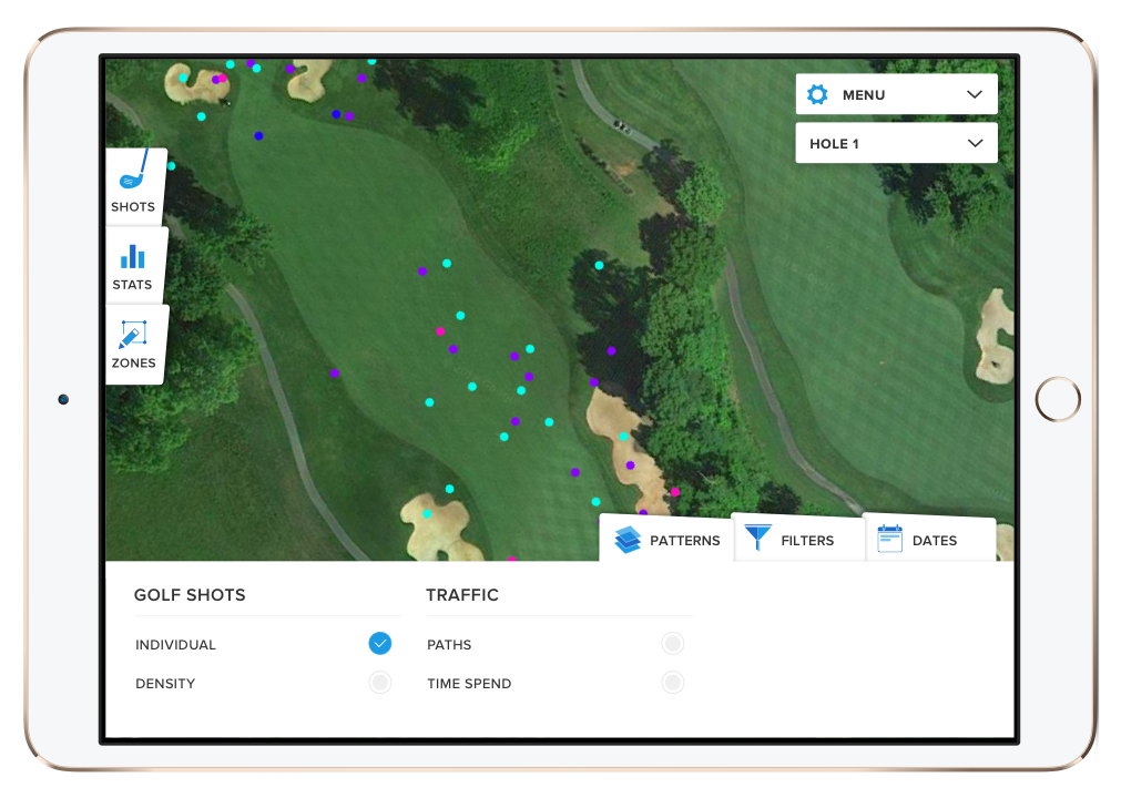 Through a series of qualitative in-situ interviews and research on economic factors and work context, focus areas were selected – flow, course layout, wear and tear and playability. Analyzing how different player types spend time on different sections of the course can help explain slow play. Areas of the course that isn’t being taken into play can be removed or reallocated and savings calculated. Visualization of where golf players stand/walk/drive will reveal heavy wear and tear. Insights about where golf balls land can be used to adjust the layout of holes to fit all player types.